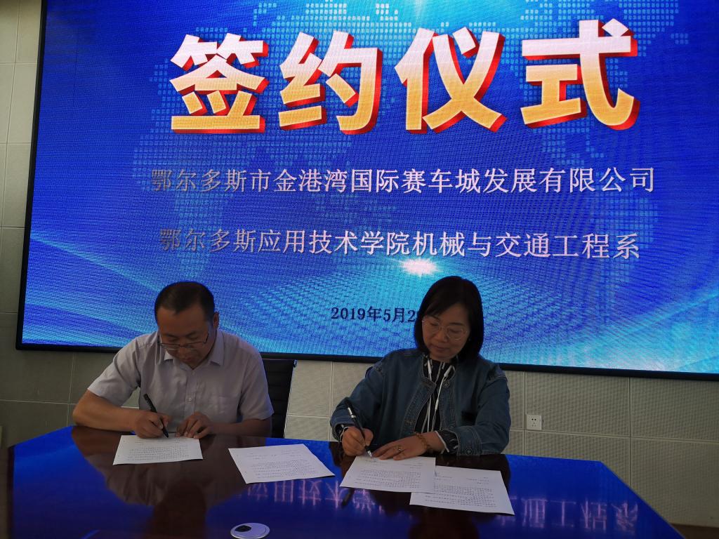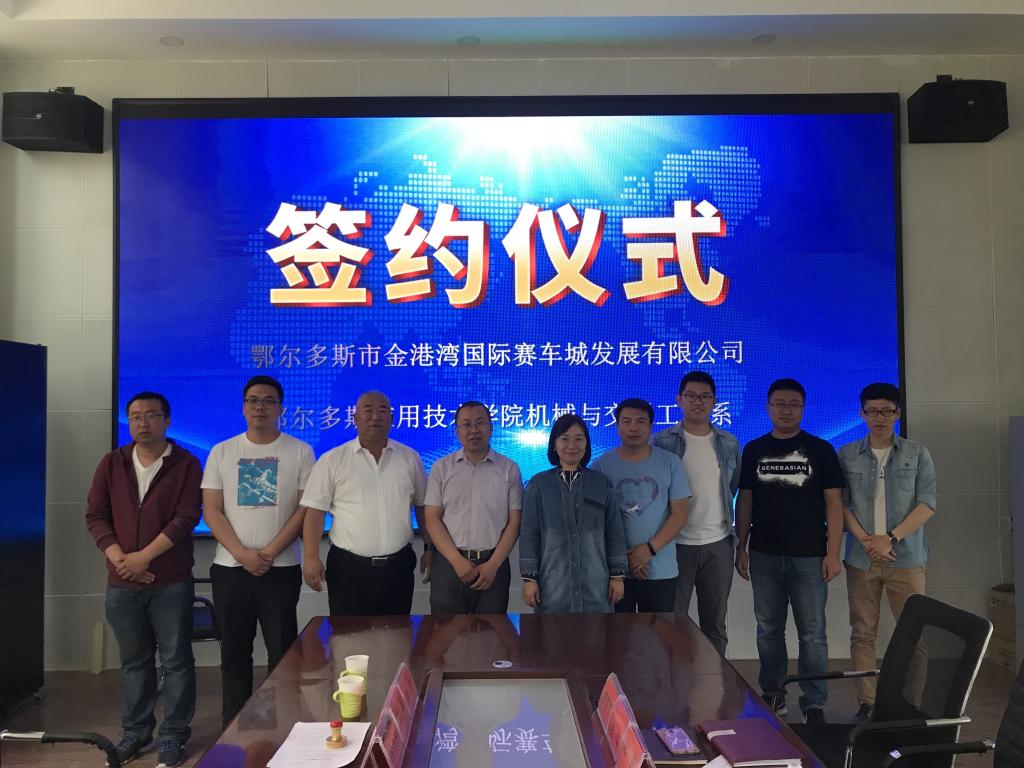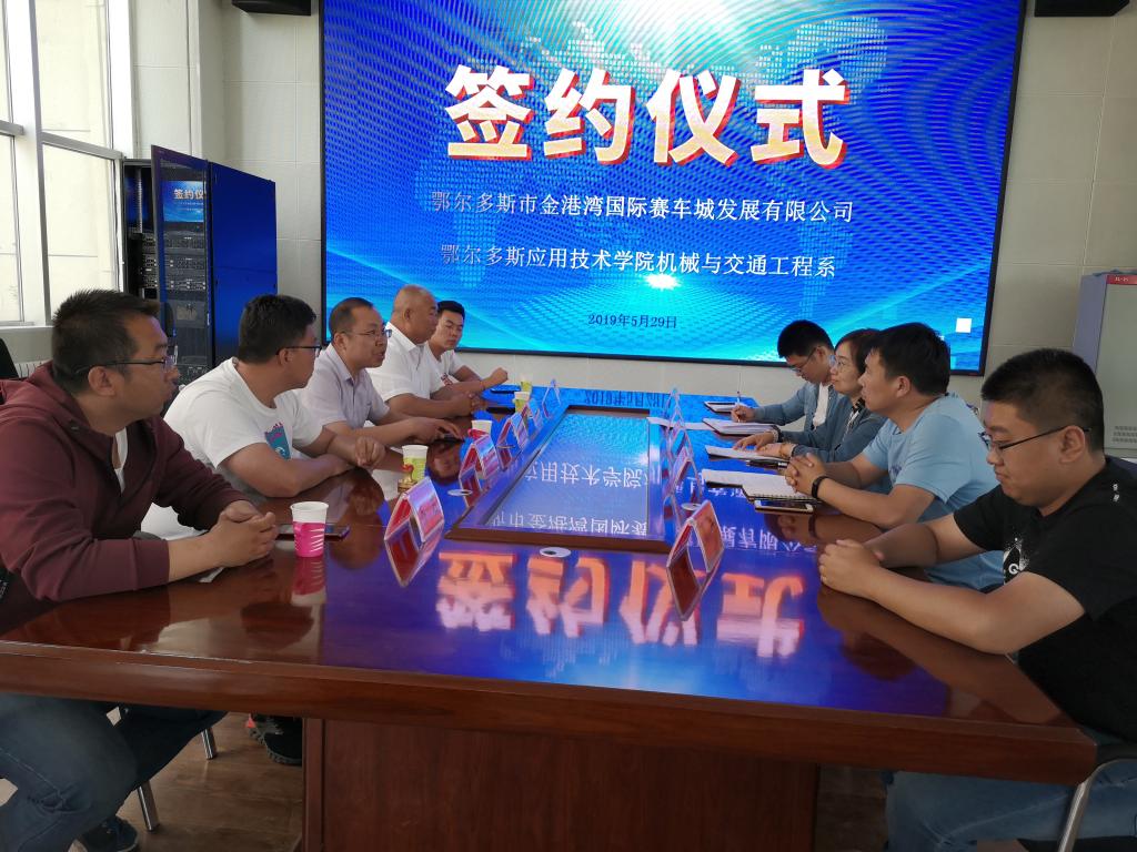 2019年5月29日下午,鄂尔多斯市金港湾国际赛车城发展有限公司总经理苏红、副总经理徐文华等一行五人到访机械与交通工程系,双方签订了合作战略协议。